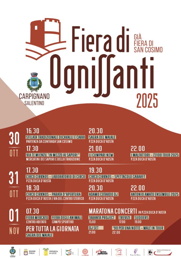 Oltre 450 espositori, più di 4 km di strade coinvolte nell’evento, circa 15mila mq di superficie di esposizione. Si svolgerà a Carpignano Salentino, da giovedì 30 ottobre all’1 novembre 2025, la Fiera di Ognissanti (della manifestazione fa parte anche la Sagra del maiale).