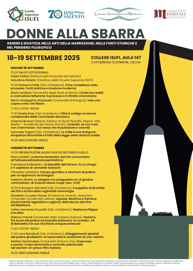Si intitola “Donne alla sbarra, genere e giustizia nelle arti della narrazione, nelle fonti storiche e nel pensiero filosofico” il seminario che si terrà giovedì 18 e venerdì 19 settembre 2025, nell’aula 147 del College Isufi, Complesso Ecotekne a Lecce.