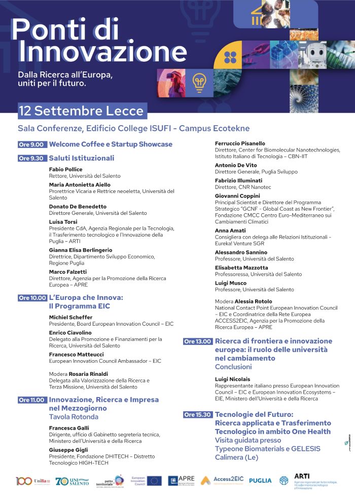 L’Università del Salento ospiterà, venerdì 12 settembre 2025, presso la sala conferenza dell’Isufi (Campus Ecotekne – Lecce), una giornata di confronto dedicata ai programmi europei per l’innovazione e al ruolo crescente delle università e dei territori nel disegno delle future politiche europee. L’evento, intitolato “European Innovation Council – Ponti di Innovazione”, è organizzato congiuntamente dall’Università del Salento e dall’Università degli Studi di Bari “Aldo Moro”, con il patrocinio della Regione Puglia e la collaborazione di Arti (Agenzia Regionale per la Tecnologia, il Trasferimento Tecnologico e l’Innovazione), Apre (Agenzia per la Promozione della Ricerca Europea) e Eismea (European Innovation Council and SMEs Executive Agency).