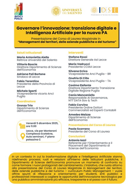 Il Dipartimento di Scienze dell’Economia dell’Università del Salento organizza per venerdì 5 dicembre 2025, alle ore 11, presso il Complesso Ecotekne (Lecce, via per Monteroni, palazzina C, Aula seminari), una tavola rotonda dedicata al tema “Governare l’innovazione: transizione digitale e Intelligenza Artificiale per la nuova PA”. L’iniziativa coincide con la presentazione del nuovo Corso di Laurea Magistrale in Management dei territori, delle aziende pubbliche e del turismo, curriculum “Public Management”.