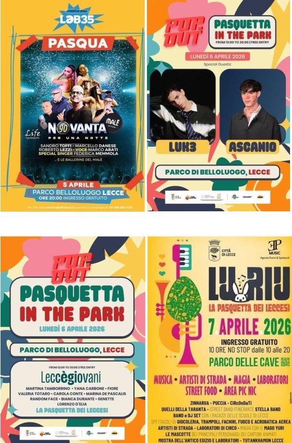 – Lunedì 6 aprile, diverse occasioni per festeggiare la Pasquetta: al Parco di Belloluogo, da mezzogiorno in poi, spettacolo live con Luk 3, Axedrev & FFL, Leccègiovani, Edoardo Manno, Ascanio; al Parco Galateo la “Pasquetta delle tradizioni leccesi”; “Pasquetta insieme”, al Centro sociale e al parco adiacente in via Roma.