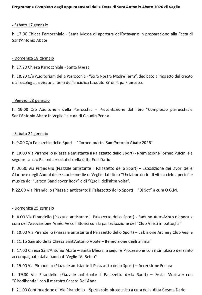 “Sora Nostra Madre Terra – Procuratevi di lasciare questo mondo un po’ migliore di come lo avete trovato”. È il titolo dell’incontro che aprirà a Veglie la settimana di eventi dedicata alla “Festa di Sant’Antonio Abate, Focara 2026”. L’appuntamento è fissato per domenica 18 gennaio 2023, alle ore 18.30, presso l’auditorium “Don Vito Frassanito” della Parrocchia Sant’Antonio Abate di Veglie.