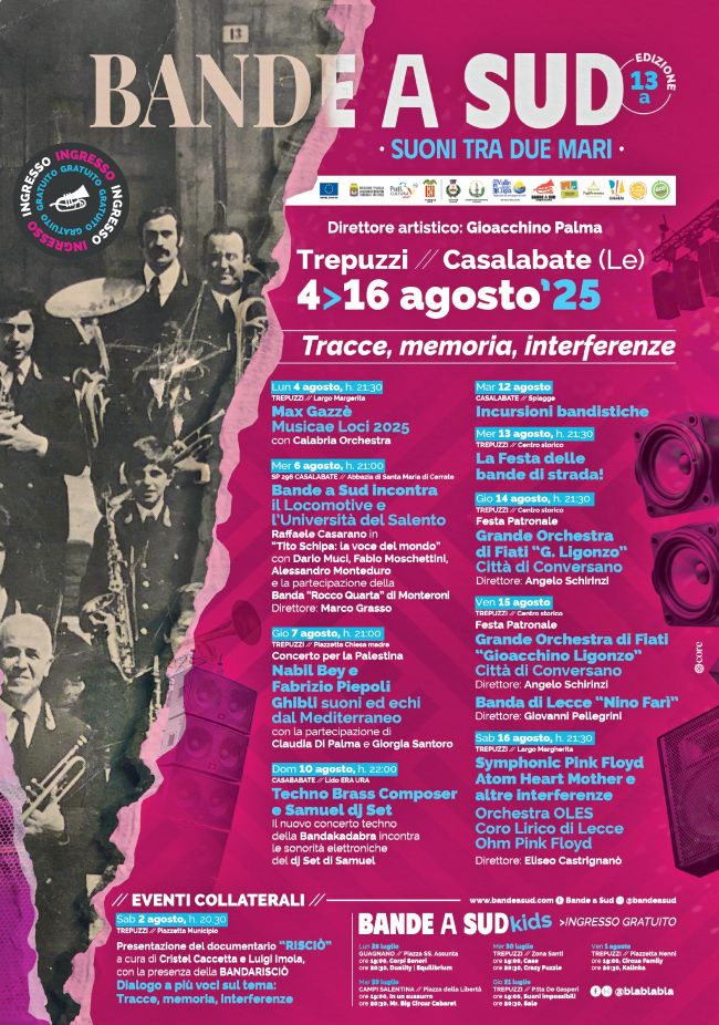 Le tracce del passato si fanno memoria, patrimonio prezioso da custodire e tramandare, e le interferenze diventano stupore, sorpresa, futuro. È in questo dialogo che prende forma la XIII edizione di “Bande a Sud – Festival degli immaginari bandistici”, in programma a Trepuzzi e Casalabate dal 4 al 16 agosto 2025, che porterà nel cuore del Salento artisti nazionali e internazionali, bande da giro, performance urbane e concerti unici, abitando piazze, vicoli, marine e periferie.