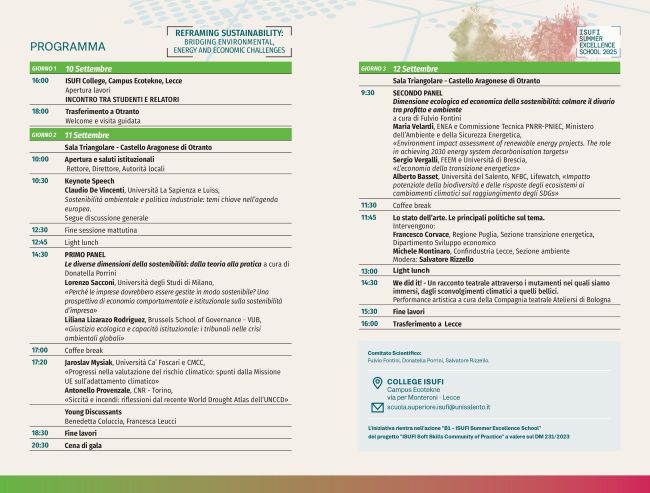 Dal 10 al 12 settembre, nella Sala Triangolare del Castello di Otranto, si terrà la Isufi Summer Excellence School “Reframing Sustainability: Bridging Environmental, Energy and Economic Challenges”, organizzata dalla Scuola Superiore Isufi dell’Università del Salento e rientrante nelle attività del progetto “Isufi Soft Skills Community of Practice” a valere sul DM 231/2023.