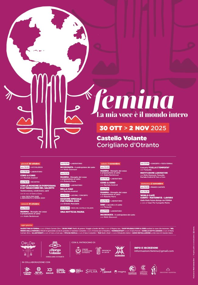 Il canto corale e la parità di genere sono gli elementi chiave dell’edizione 2025 di “Femina – La mia voce è il mondo intero”, la residenza artistica ideata e curata da “Coro a Coro Aps”, con il patrocinio di Provincia di Lecce, Commissione Pari opportunità provinciale e Comune di Corigliano d’Otranto, in collaborazione con Big Sur, Coolclub, Multi-Service Eco, Fondazione Sylva (partner per la Sostenibilità e l’Ambiente), Donne per la Palestina e Magma Aps.