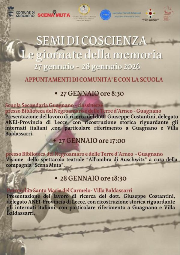 Gli eventi si terranno nella la Biblioteca del “Negroamaro e delle Terre d’Arneo” (27 gennaio, ore 8.30, presentazione del lavoro di ricerca sugli internati a cura del guagnanese Giuseppe Costantini; ore 17, spettacolo teatrale “All’ombra di Auschwitz” della compagnia “Scena Muta”) e presso la Parrocchia “Santa Maria del Carmelo” di Villa Baldassarri (28 gennaio, ore 18.30, incontro con Giuseppe Costantini). Ingresso è libero per tutte le iniziative della rassegna. (red.)