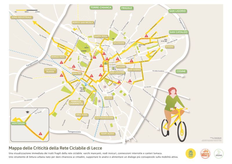 “Tra mancata manutenzione, pezzi di piste cancellati inopinatamente e cantieri lumaca, la rete di piste ciclabili in città è allo sbando”. La “denuncia” è del movimento di cittadinanza attiva LeccePedala il quale, nella giornata di oggi, ha diffuso un comunicato per rendere noto di aver scritto una lettera al sindaco di Lecce, Adriana Poli Bortone. Con il documento LeccePedala chiede “una decisa inversione di rotta”, comunicando di aver elaborato una mappa “da cui si deduce quanto siano diffuse le criticità di piste e percorsi ciclabili in città”.