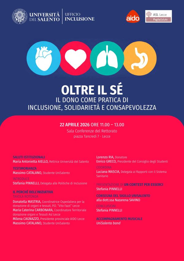 L’Università del Salento ospiterà mercoledì 22 aprile 2026, dalle ore 11 alle 13, nella sala conferenze del Rettorato (piazza Tancredi 7, Lecce), l’evento “Oltre il Sé. Il dono come pratica di inclusione, solidarietà e consapevolezza”, promosso dall’Ufficio Inclusione di ateneo in collaborazione con Aido e Asl Lecce.