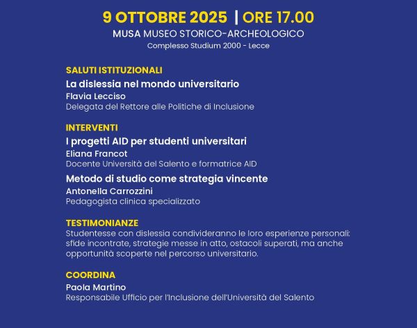 Giovedì 9 ottobre 2025, alle ore 17, presso il Musa – Museo Storico Archeologico (Complesso Studium 2000, via di Valesio, Lecce), si terrà l’incontro formativo universitario “Vivere la Dislessia: tra opportunità e ostacoli, le sfide dell’Università”.
