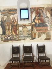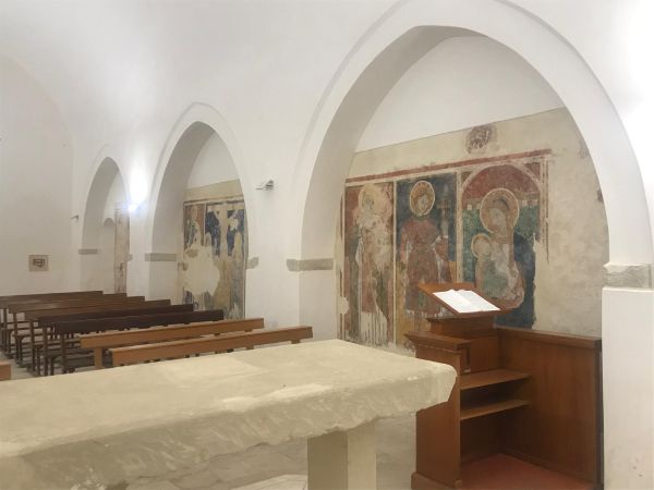 Varcata la soglia, il silenzio che avvolge l’ariosa navata di forma rettangolare con volta a botte, dispensa serenità, ed alla vista dell’altare sul fondo con il presbiterio quadrato, anche spiritualità. Ma è alle spalle di quest’ultimo e del muro di sinistra, che splende la vera bellezza della chiesa, prosperosa col suo Monastero nel Medioevo, ed anche se di semplice struttura, buon esempio di architettura normanno-sveva. Bellezza ch’è fatta di un ciclo pittorico di pregio, qui distribuito su tre archi gotici, e dietro l’altare, su uno più ampio, costituiti da personaggi quasi tutti a figura intera e dai colori vividi, fra i quali spiccano il rosso ed il blu. Prima di ammirarli uno ad uno, lo sguardo si posa però, all’inizio del muro destro, sulla testa d’una Madonna infilzata da tre lance, con la lettera S in basso, che probabilmente indica lo status di “sancta”.