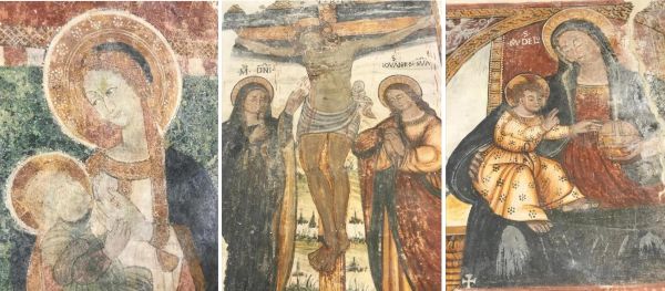 Varcata la soglia, il silenzio che avvolge l’ariosa navata di forma rettangolare con volta a botte, dispensa serenità, ed alla vista dell’altare sul fondo con il presbiterio quadrato, anche spiritualità. Ma è alle spalle di quest’ultimo e del muro di sinistra, che splende la vera bellezza della chiesa, prosperosa col suo Monastero nel Medioevo, ed anche se di semplice struttura, buon esempio di architettura normanno-sveva. Bellezza ch’è fatta di un ciclo pittorico di pregio, qui distribuito su tre archi gotici, e dietro l’altare, su uno più ampio, costituiti da personaggi quasi tutti a figura intera e dai colori vividi, fra i quali spiccano il rosso ed il blu. Prima di ammirarli uno ad uno, lo sguardo si posa però, all’inizio del muro destro, sulla testa d’una Madonna infilzata da tre lance, con la lettera S in basso, che probabilmente indica lo status di “sancta”.