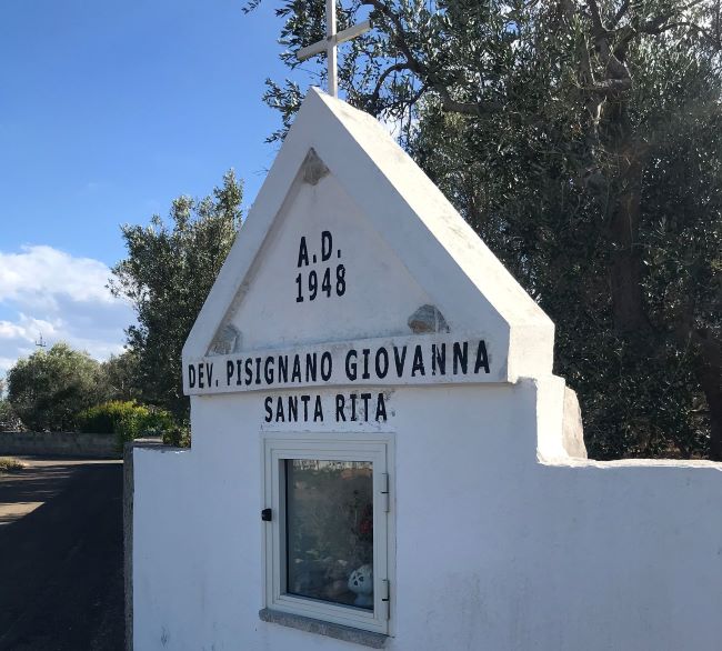 Un’edicola votiva intitolata a Santa Rita, segna l’ingresso nella zona archeologica, mai adeguatamente valorizzata. Bassi muretti a secco, delimitano due pagghiare, una delle quali col forno di pietra, un paio di aie che per tornare a vivere, hanno solo bisogno dei contadini intenti al lavoro, ed a livello del suolo, una grata sotto la quale s’apre una vecchia cisterna sul cui fondo si intravede l’acqua.