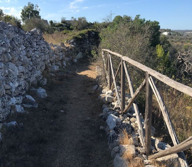 Per imbattersi nelle possenti mura della città antica, bisogna tornare indietro e percorrere uno stretto sentiero sterrato. Da una parte, una traballante staccionata in legno, lo isola dalla collina che scende a valle, sino alla frazione di Castrignano del Capo, Giuliano. Dall’altra sono grosse e spesse pietre che s’alzano sino a raggiungere i due metri. Fanno parte della cinta muraria del IV secolo avanti Cristo, che in origine si sviluppava per almeno tre chilometri. Per reggere il peso delle altre, alla base sono le più possenti, che a dar credito alla leggenda, sono dello stesso tipo delle prime con cui venne poi eretta Patù, ed in numero di cento, il mausoleo sepolcrale del IX secolo per questo detto Centopietre, che si staglia di fronte alla chiesa di San Giovanni Battista del VI secolo.