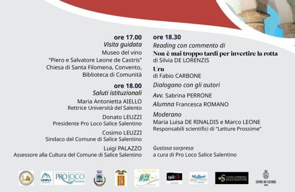 Appuntamento della Rassegna “Letture prossime” a Salice Salentino. Sabato 28 febbraio 2026, alle ore 18, nella Sala degli Affreschi del Convento “Madonna della Visitazione”, saranno protagonisti i libri “Non è mai troppo tardi per invertire la rotta” (Kimerik, 2022) di Silvia De Lorenzis e “Uru” (Fernandel, 2023) di Fabio Carbone. Dopo i saluti istituzionali delle autorità presenti, ci sarà il reading con commento delle due opere.